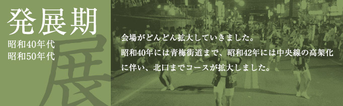 当初、現高円寺パル商店街だけで行われていたが、昭和40年に現ルック商店街も参加して、高円寺駅から青梅街道まで演舞場が拡大した。